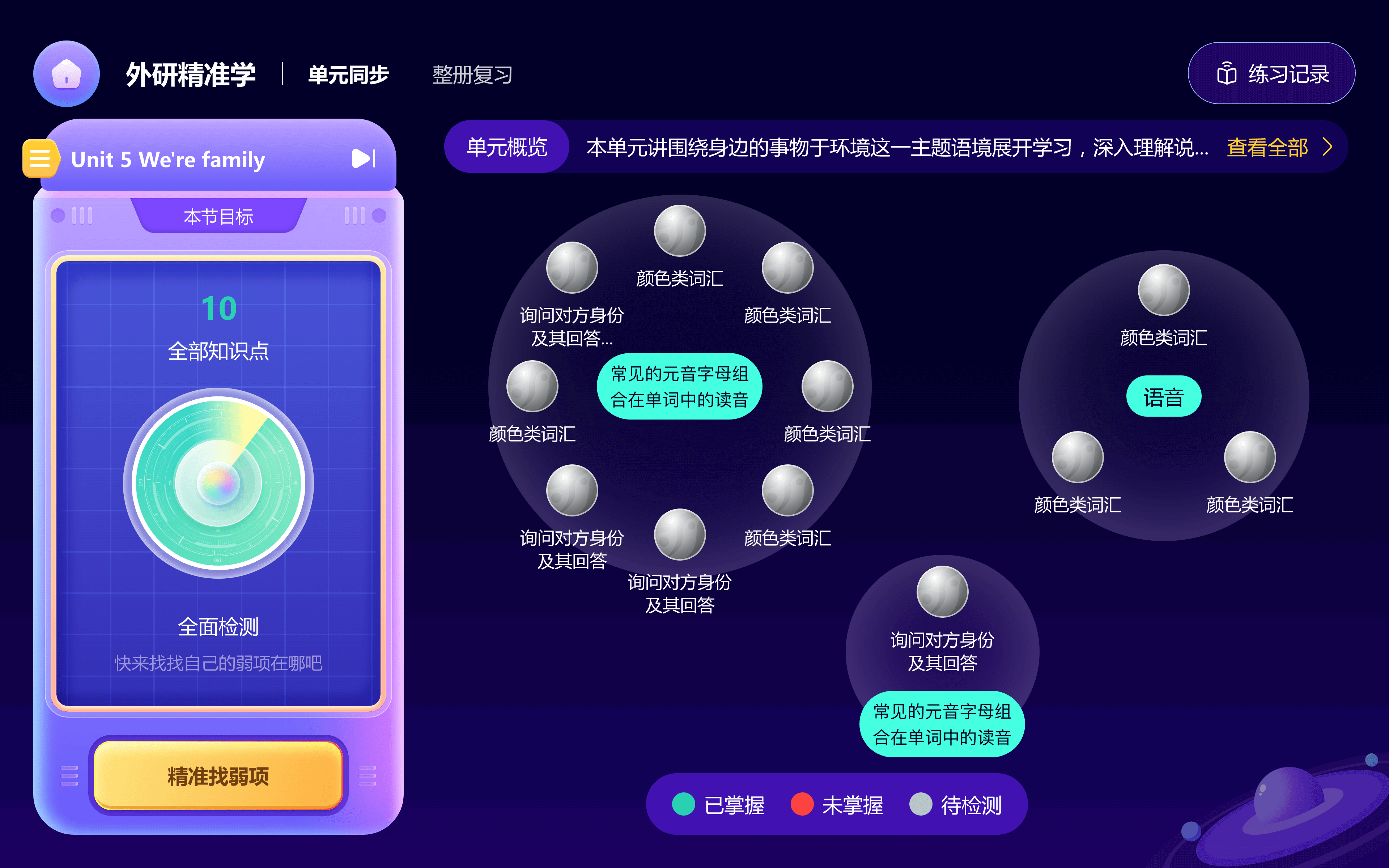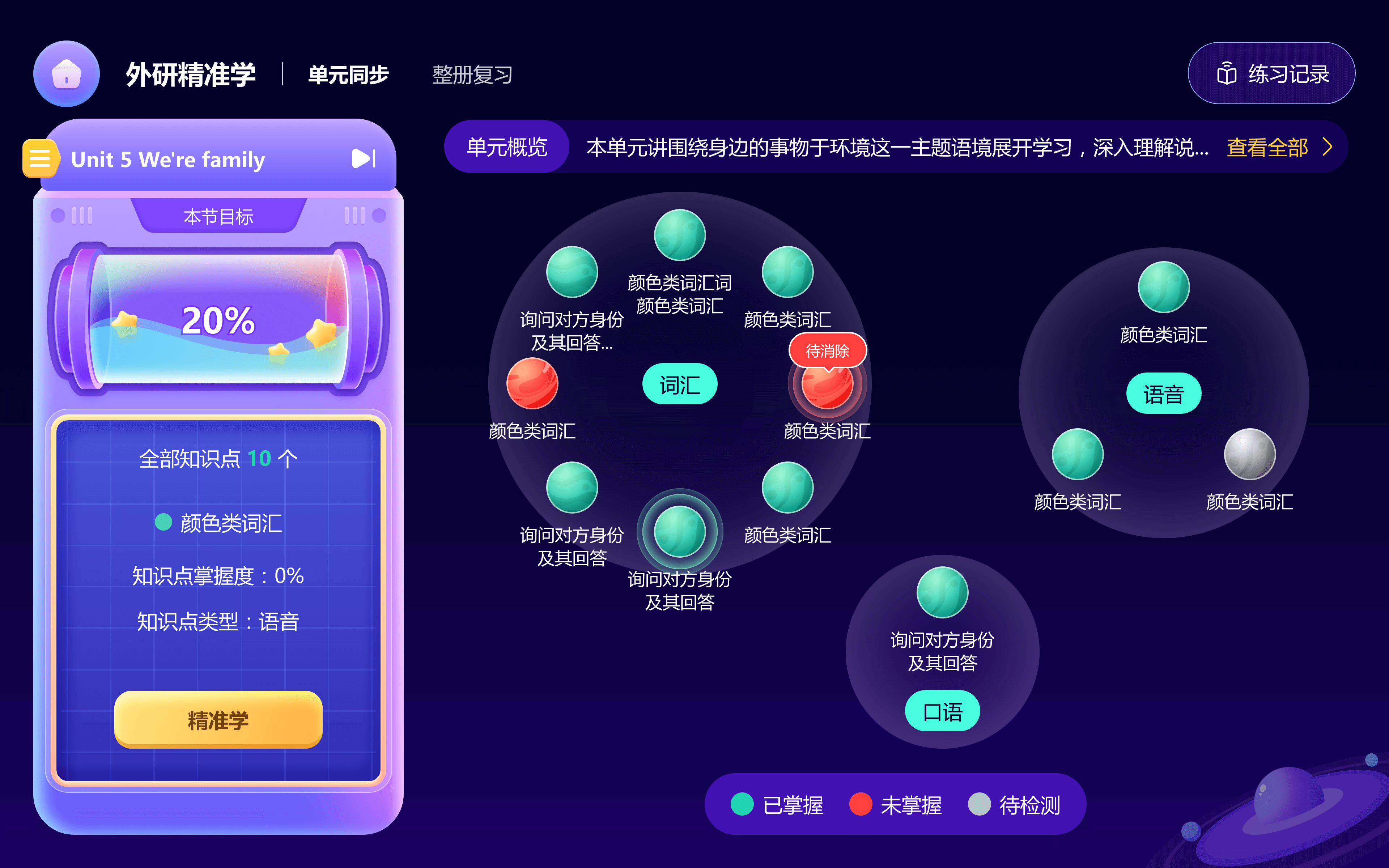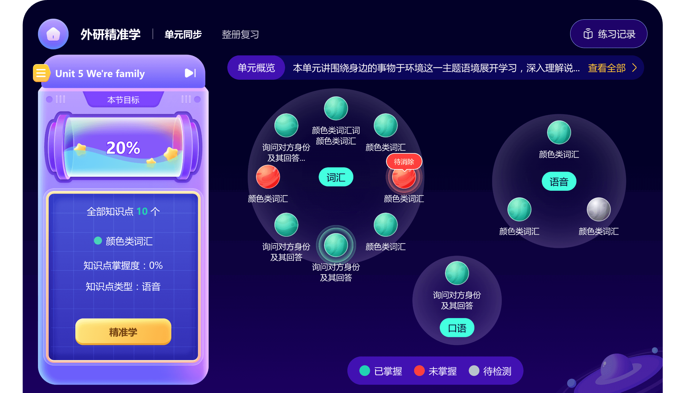 状态定位:生成知识图谱,用不同颜色球体展示知识点掌握状态,明确单元内的薄弱点。