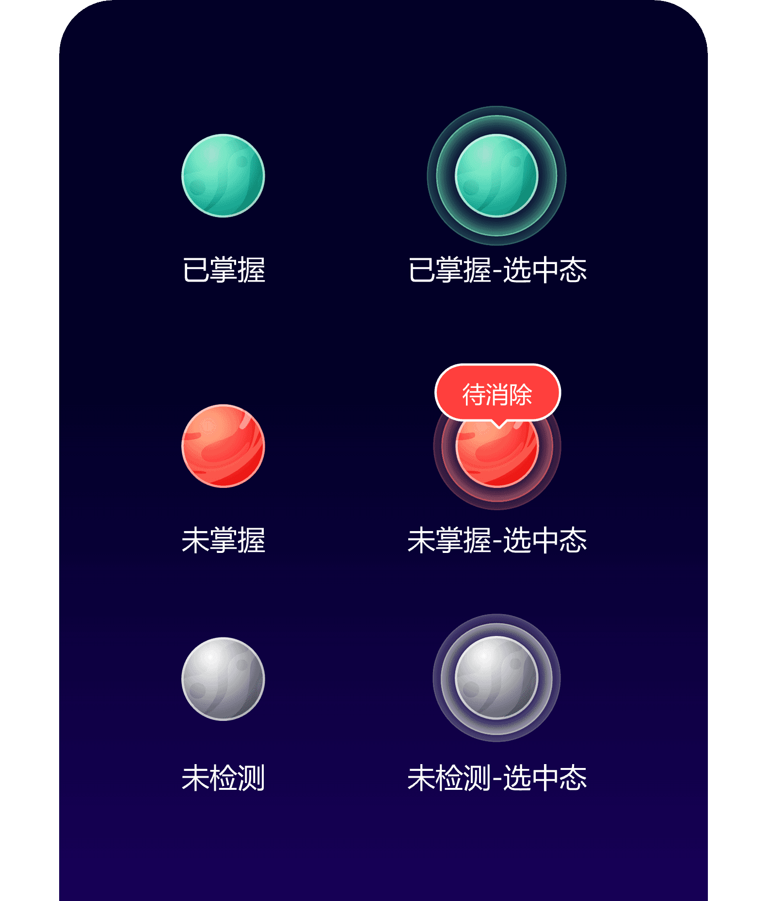 点击知识点球体可展开详情(名称、掌握程度、练习入口),按钮悬浮时变色并触发光效,完成练习后球体颜色实时更新,提供即时成就感