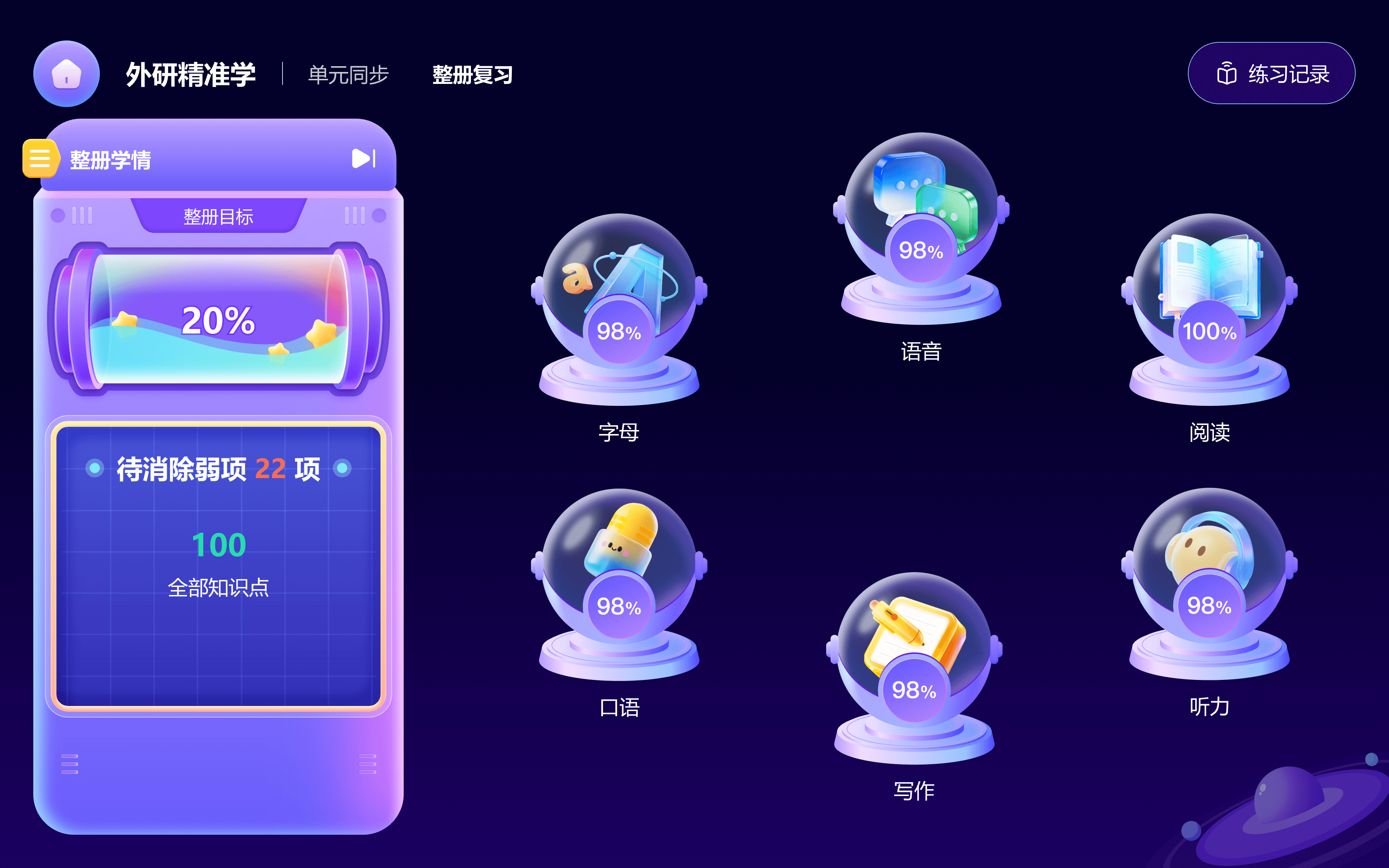 整体概览:进入整册复习页面,左侧卡片展示整册进度,右侧图标展示各能力模块的掌握率